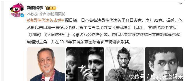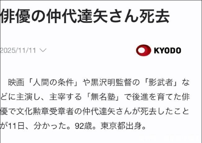 日本著名演员仲代达矢于11日去世,享年92岁。